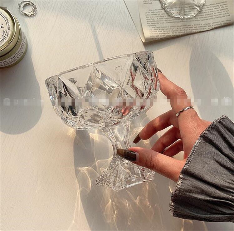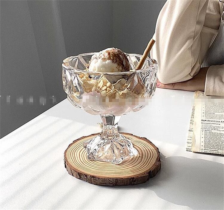 "立体的な菱形彫刻で、日光の下でさらに透き通っていて、これはとても厚くて穏やかなアイスクリームカップですよ、